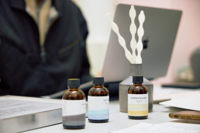 「artme」というアート(art)とアロマ(arome)をかけた商品名となっています。ボトルは清水焼の器で、窯元さんにオリジナルで作ってもらいました。香りも3種類あり、クロモジやスミレ、杉など京都の植物を使っています。京都の素材にこだわった、メイドイン京都の商品です。