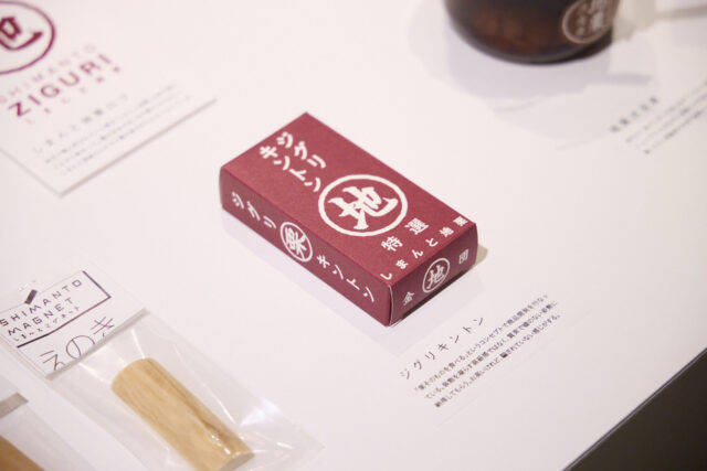 展示コーナーに入るとまず目に飛び込んでくるのは、梅原さんがプロデュースした作品と、壁に大きく書かれたキャッチコピー。柚子の産地として有名な高知県・馬路村の「ゆずの村」ブランドや、「ないものはない」とどこか開き直ったような島根県の離島・海士町のキャッチコピーなど、印象的な作品が並びます。